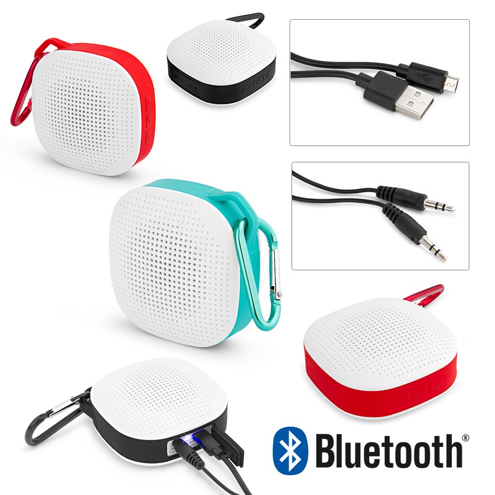 Altavoz Bluetooth V4.1, con función de manos libres. Potencia de salida: 3W 4Ω, altavoz: D40MM (130-20KHZ). Batería de polímero 500mAh. Tiempo de reproducción 2,5 – 3 horas, distancia aprox. 10 mt. Incluye cable de carga, cable auxiliar 3,5 mm y gancho carabinero.