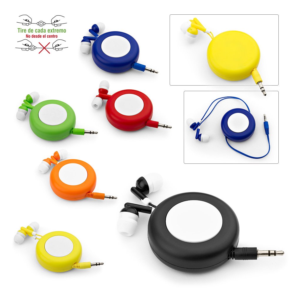 Audífonos intraaurales de conexión alámbrica, con sistema tipo yoyo para transportarlos fácilmente. Sensibilidad del altavoz 102 +- 5db/mW, impedancia 32ohm, rango de frecuencia: 20-20.000Hz, cable de plug estándar 3,5 mm. Longitud del cable 1,2 m.