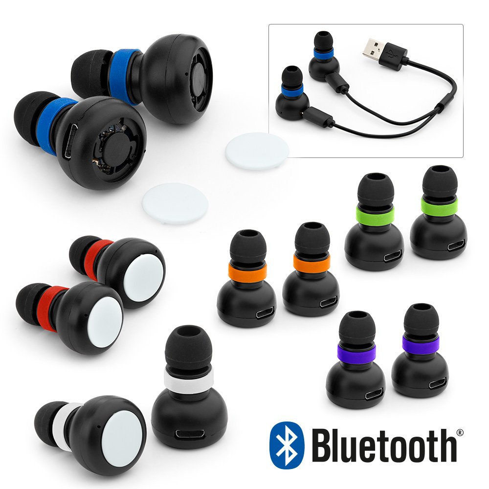 Audífonos intraaurales Bluetooth V4.2, salida del altavoz: 16ohm 5mW*2, batería 40mAh *2, tiempo de reproducción: 3 horas, tiempo de carga 1 hora. Potencia de carga 5V/ 1A. (El estuche no tiene función de carga). Tapas removibles para faciliar la impresión.
