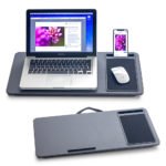 Bandeja para portátil en madera MDF alta densidad, laminada en PVC y con partes plásticas en polipropileno, área inferior en tela con interior espumado.
