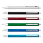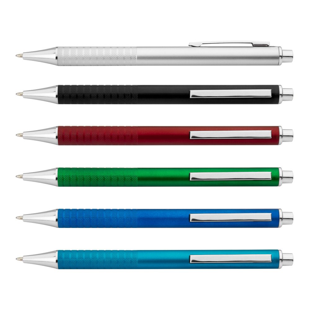 Bolígrafo con sistema retráctil, clip y punta plateados, grabado en la parte inferior que sirve como antideslizante.