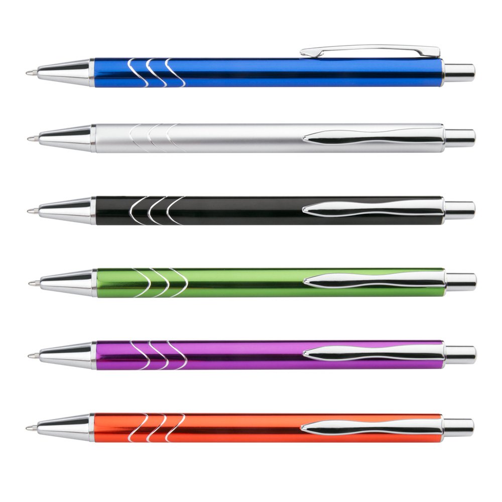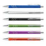 Bolígrafo en aluminio con acabado brillante. Sistema de apertura retráctil. Clip y punta plateada.