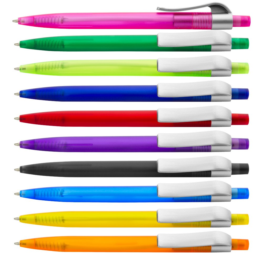Bolígrafo retráctil con cuerpo traslucido de color y clip plateado.