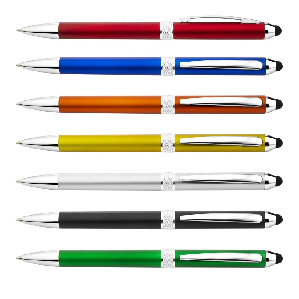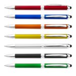 Bolígrafo con sistema Twist, cuerpo sólido de color, clip y punta plateados, stylus en la parte superior.