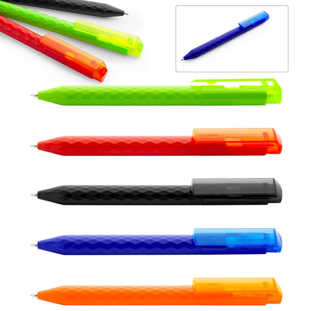 Bolígrafo con sistema retráctil, cuerpo sólido con diseño geométrico de color y clip transparente.