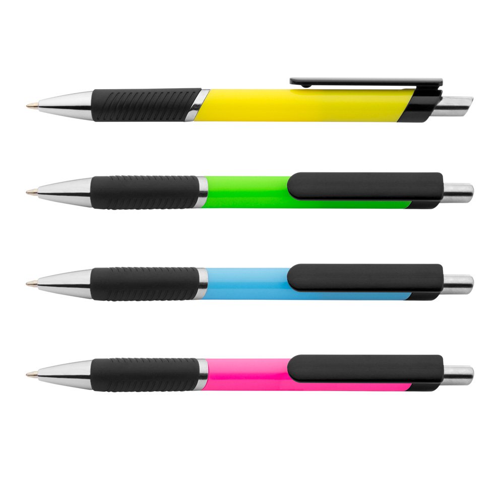 Bolígrafo retráctil con cuerpo sólido neón, antideslizante y clip de color negro, punta y botón plateados.