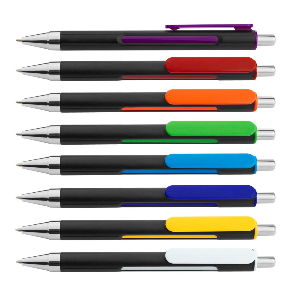 Bolígrafo retráctil con cuerpo negro sólido, clip y barril interno de color, punta y botón plateados.