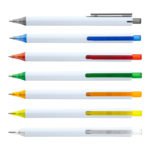 Bolígrafo retráctil con cuerpo blanco sólido, punta, botón y clip de color traslucido.