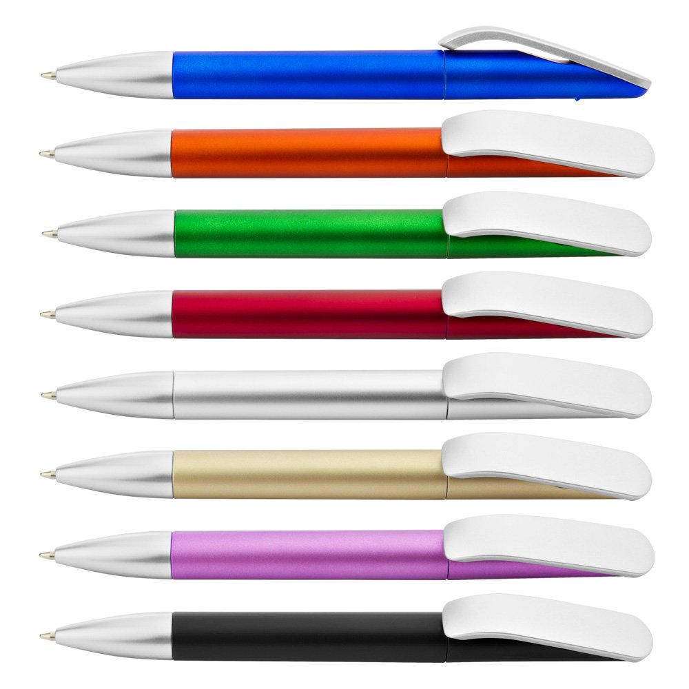 Bolígrafo plástico con sistema de apertura twist, clip y punta de color plateado y acabado sólido.