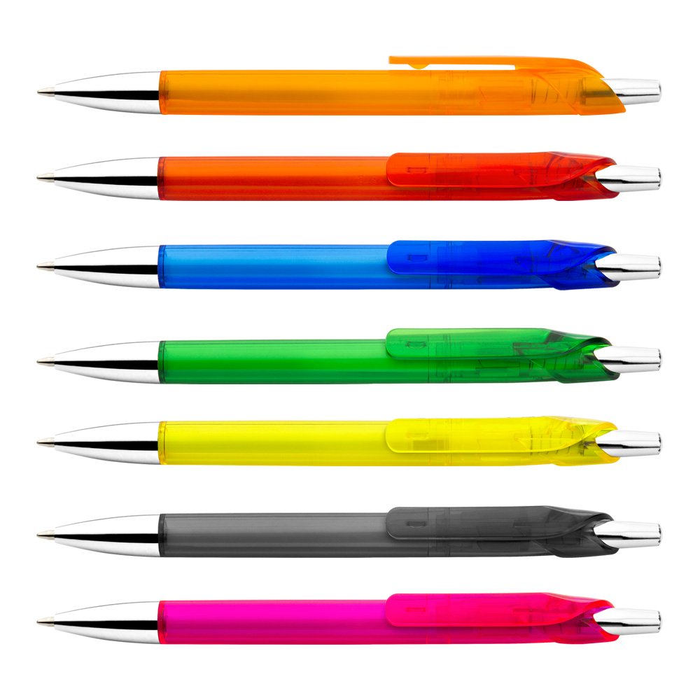 Bolígrafo retráctil con cuerpo de color traslucido, punta y botón plateados. Mina tipo Jumbo.