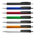 Bolígrafo retráctil con acabado geométrico, clip negro y punta plateada. Mina tipo Jumbo.