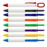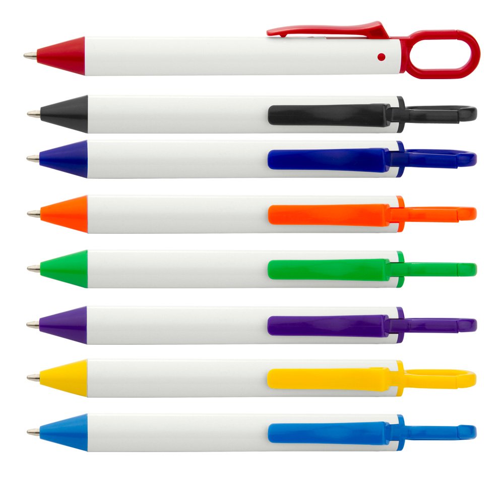 Bolígrafo retráctil con cuerpo blanco sólido, punta y clip de color. Con gancho carabinero para transportar fácilmente.
