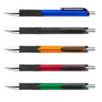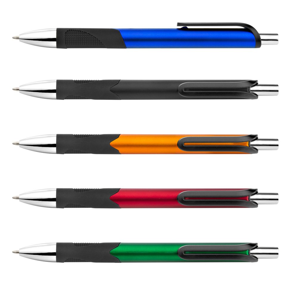 Bolígrafo retráctil con cuerpo sólido, clip y antideslizante negro, punta plateada.