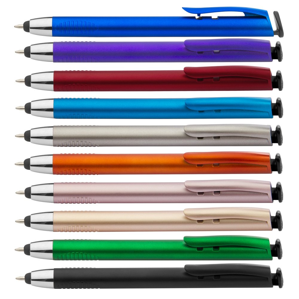 Bolígrafo plástico con stylus y sistema retráctil, el clip funciona como mecanismo para ingreso de la mina, punta plateada y parte superior que funciona como holder para el celular.