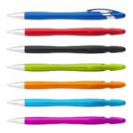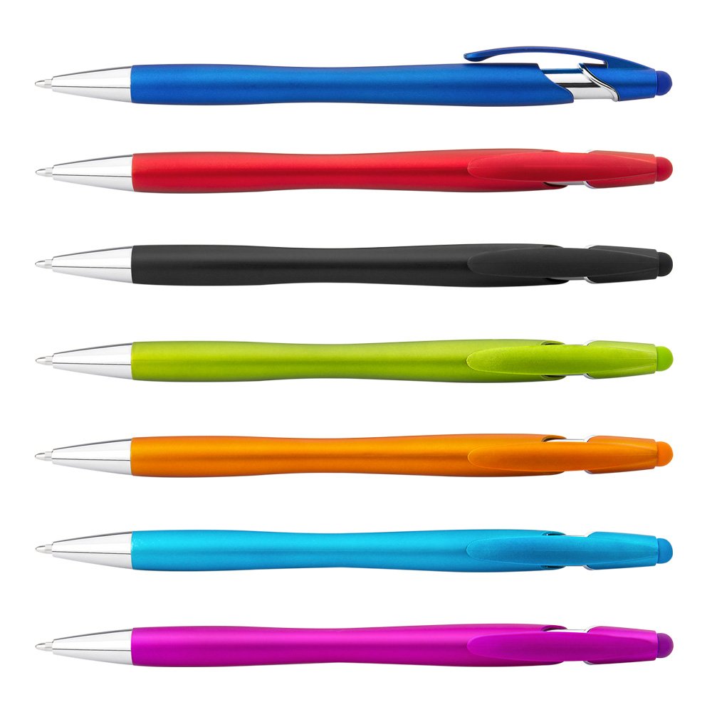 Bolígrafo plástico con stylus en la parte superior, sistema de apertura retráctil, punta plateada.