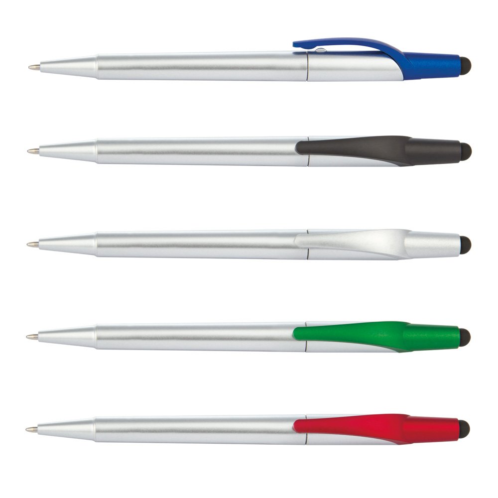 Bolígrafo plástico con barril plateado y touch en la parte superior, sistema de apertura twist.