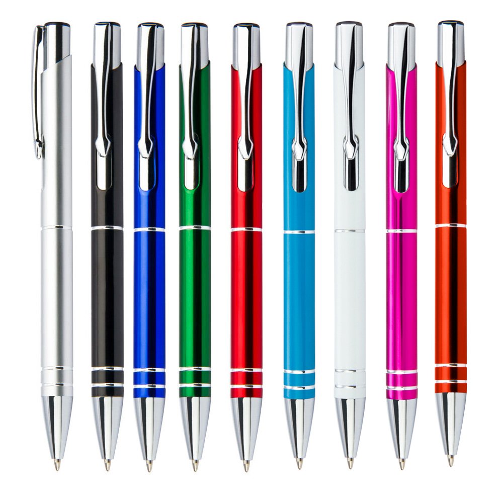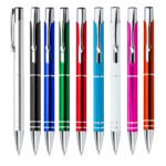 Bolígrafo en aluminio con sistema de apertura retráctil, anillos al contorno de la parte inferior y medio.