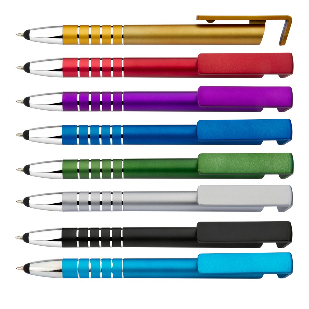 Bolígrafo con acabado metalizado, punta plateada, el clip funciona como holder para los dispositivos móviles. Sistema de apertura retráctil y stylus en la parte inferior.