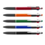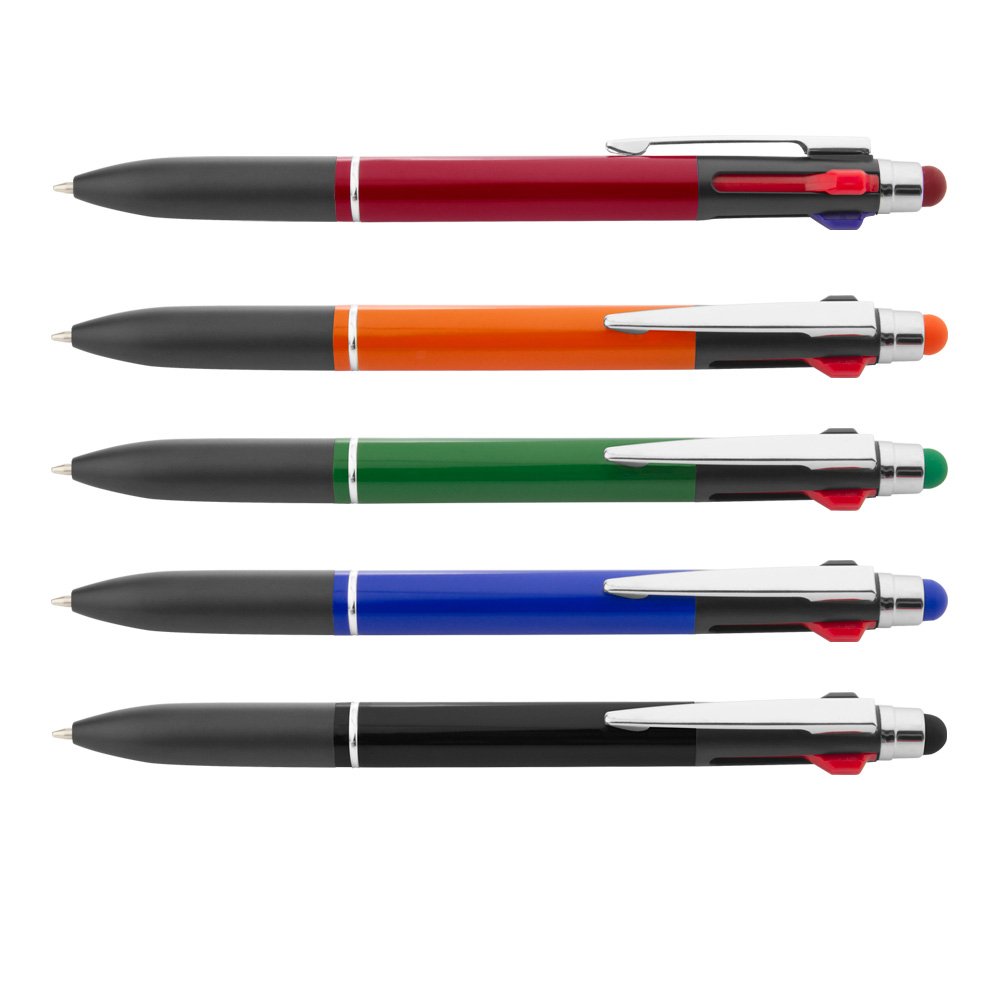 Bolígrafo retráctil con tres minas de diferentes colores (azul, rojo y negro). Práctico touch para dispositivos de pantalla táctil y antideslizante.