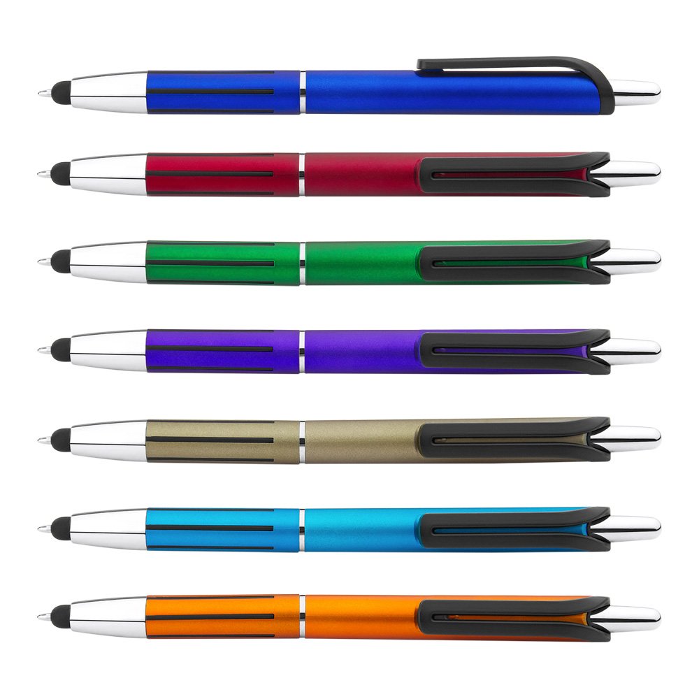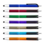 Bolígrafo plástico con sistema de apertura retráctil y stylus en la punta, color sólido, clip y antideslizante de color negro.