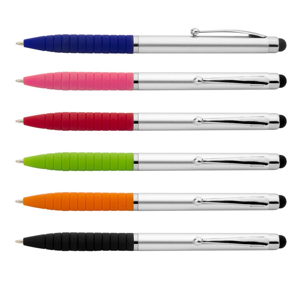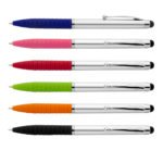 Bolígrafo con sistema Twist y stylus en la parte superior. Antideslizante de color.