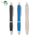 Bolígrafo plástico. Mezcla con material ecológico en fibra de trigo (50% aprox). El porcentaje de material ecológico tiene un promedio de biodegradabilidad de 2-3 años después del fin de su vida útil. Clip metálico. Mecanismo push.