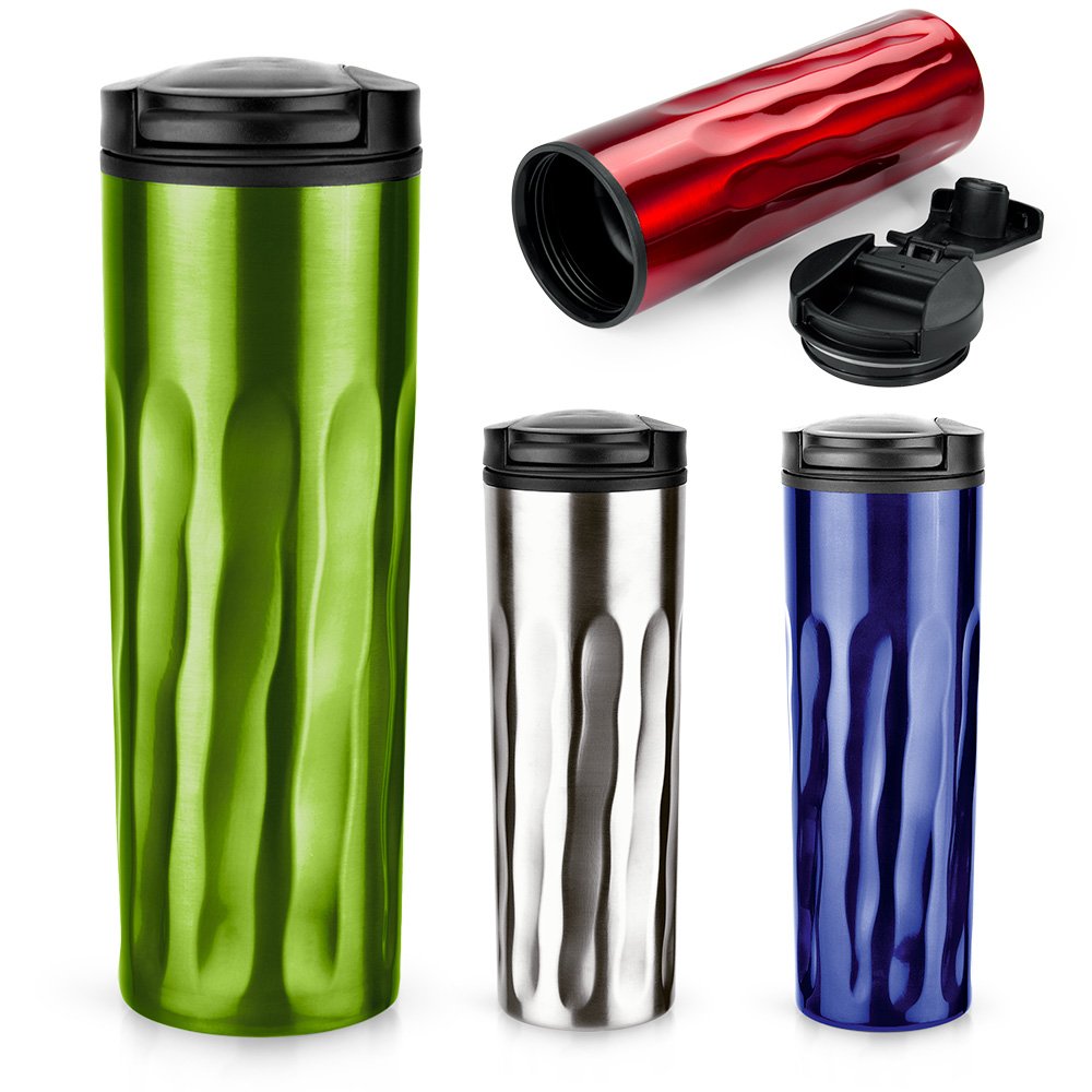 Doble pared con recubrimiento interno en PP, tapa con cierre tipo rosca, boquilla con cierre a presión y acabado geométrico. Capacidad: 470 ml / 16 Oz.