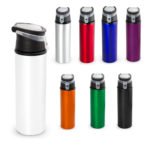 Botella de aluminio con agarradera, tapa rosca y boquilla con cubierta plástica. Libre de BPA u otras sustancias nocivas. No retiene ni transmite sabores. Pintura exterior atóxica. Capacidad 600 ml./ 20 Oz.