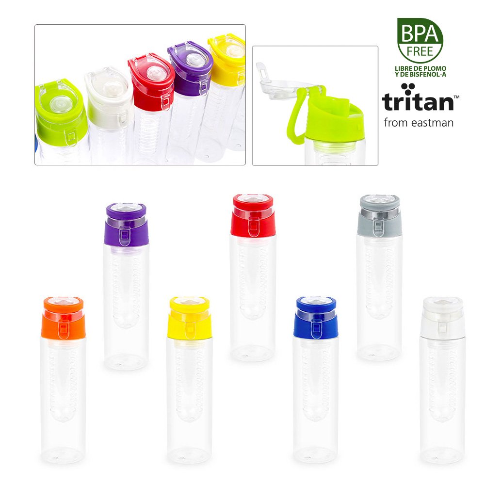 Botella deportiva con agarradera, tapa rosca y boquilla con cubierta plástica, tubo de filtro en el centro ideal para hacer infusiones, libre de BPA, ftalatos u otras sustancias nocivas. No retiene ni transmite sabores u olores. No es para líquidos calientes. Capacidad 650 ml. 22 Oz. Capacidad 650 ml / 22 Oz.