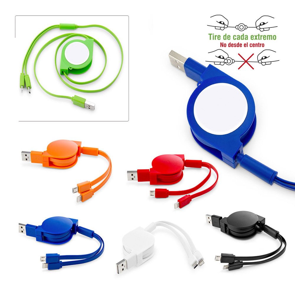 Multiconector tipo Yoyo, con 2 conectores de carga: Micro USB para dispositivos Android y Lightning para Iphone.