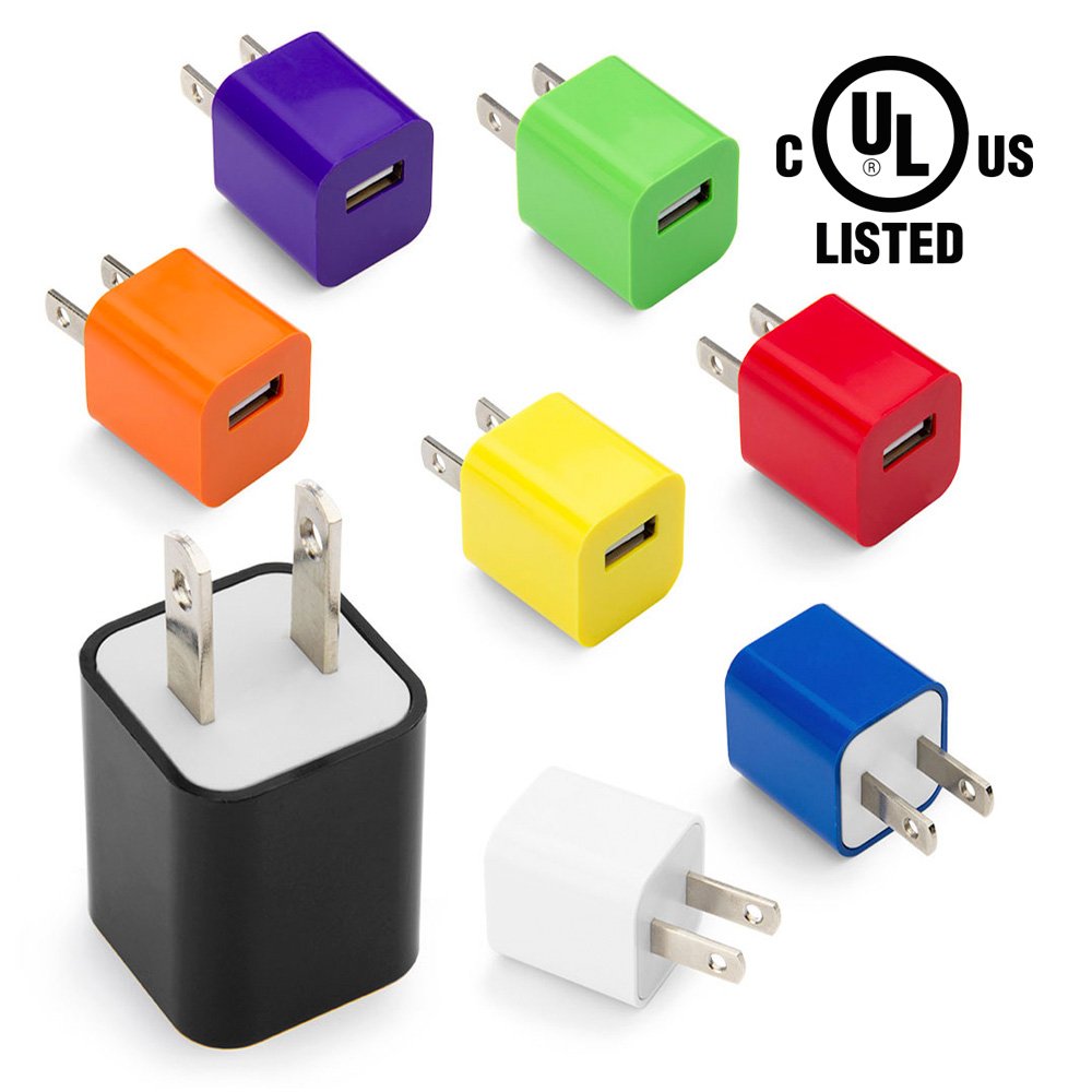 Cargador de pared con 1 puerto USB, entrada 100-240V – 50/60Hz 0,15A, salida 5V-1A. Cuenta con Certificado de Seguridad UL (E361273).