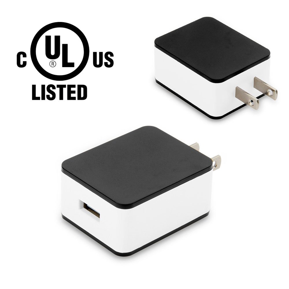 Cargador de pared con función de carga rapida 1 puerto USB, salida: 5V-2.4A, 9V-1.67A, 12V-1.3A, entrada 100-240V, 0,15A 50/60Hz. Cuenta con Certificado de Seguridad UL. (E361273)