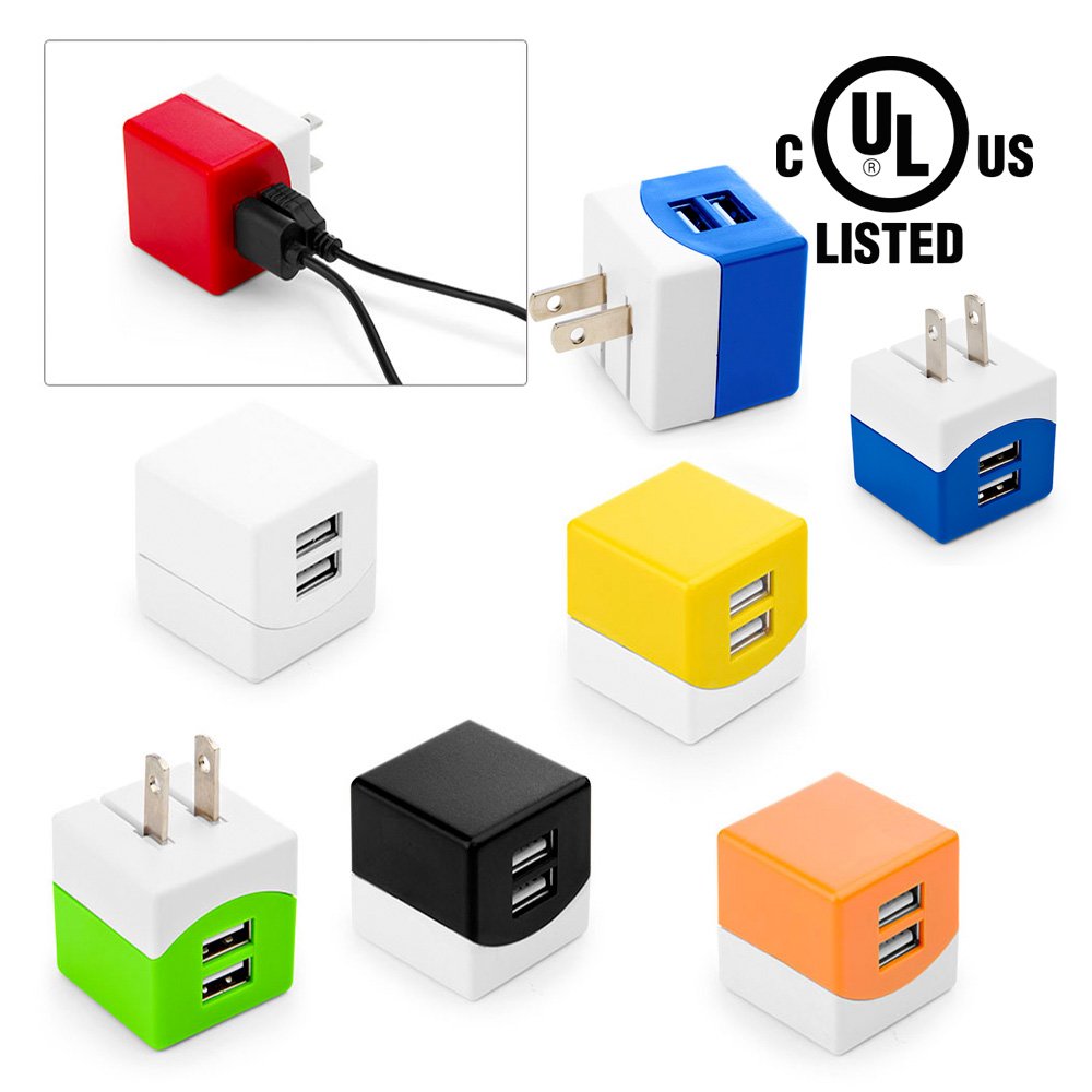 Cargador de pared con 2 puertos USB, entrada 100-240V – 50/60Hz 0,15A, salida 5V-1A. Cuenta con Certificado de Seguridad UL (E361273).