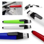 Cable de carga en forma de bolígrafo con stylus y limpiador de pantalla táctil. Conector Micro para dispositivos Android y adaptador de carga Lightning para dispositivos Iphone.