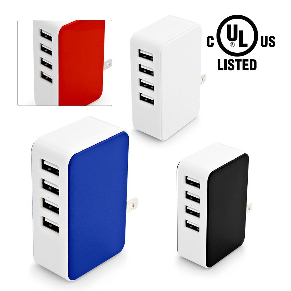 Cargador de pared con 4 puertos USB, entrada 100-240 V, 50/60Hz, salida 5V- 4.8A(total puertos). Cuenta con Certificado de Seguridad UL (E361273).