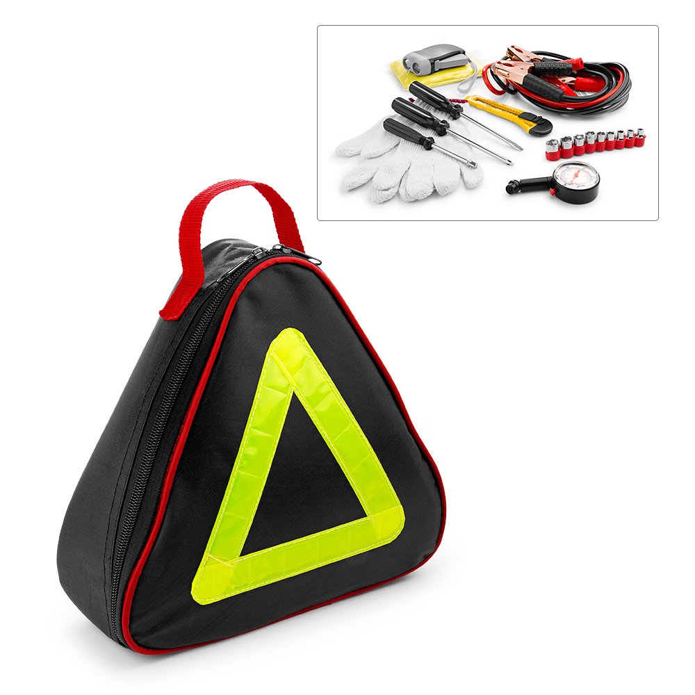 Kit de emergencia para automóvil. Contiene: 1 destornillador tipo Phillips, 1 destornillador tipo pala, 1 par de guantes, 1 bisturí, cables para batería, 1 linterna dynamo, 1 capa impermeable, 1 adaptador de copa, 9 puntas de copas (de 5 a 12 mm), 1 estuche, triangulo reflectivo 1 calibrador.