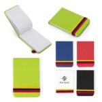 Libreta de notas vertical con cubierta en PU y banda elástica de color de la bandera de Colombia. 80 hojas de papel rayado. Tamaño aproximado de la hoja A7.