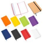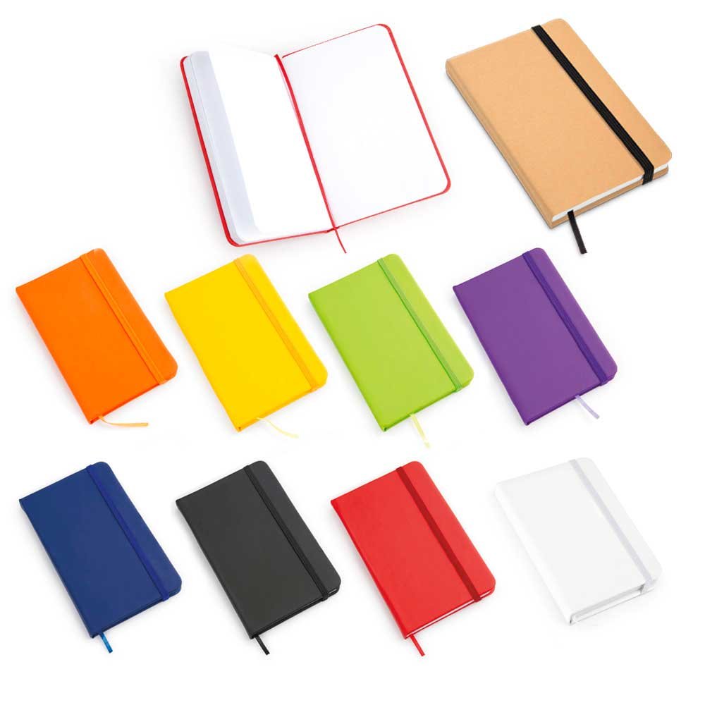 Libreta con cubierta forrada en imitación cuero. La libreta de color Natural viene con cubierta de cartón reciclado, con banda elástica de cierre. Cinta marcadora. 80 hojas blancas. Tamaño aproximado A6.