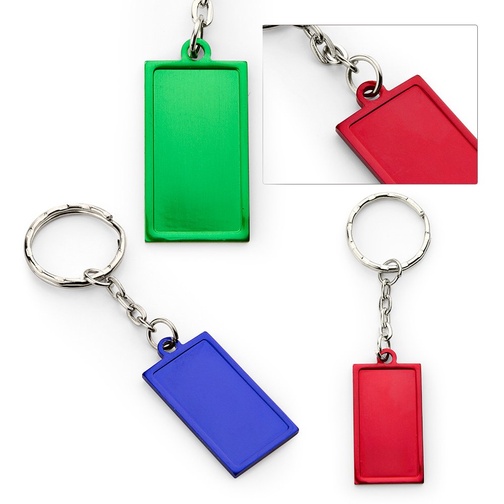 Llavero en aluminio con diseño rectangular y acabado metalizado.