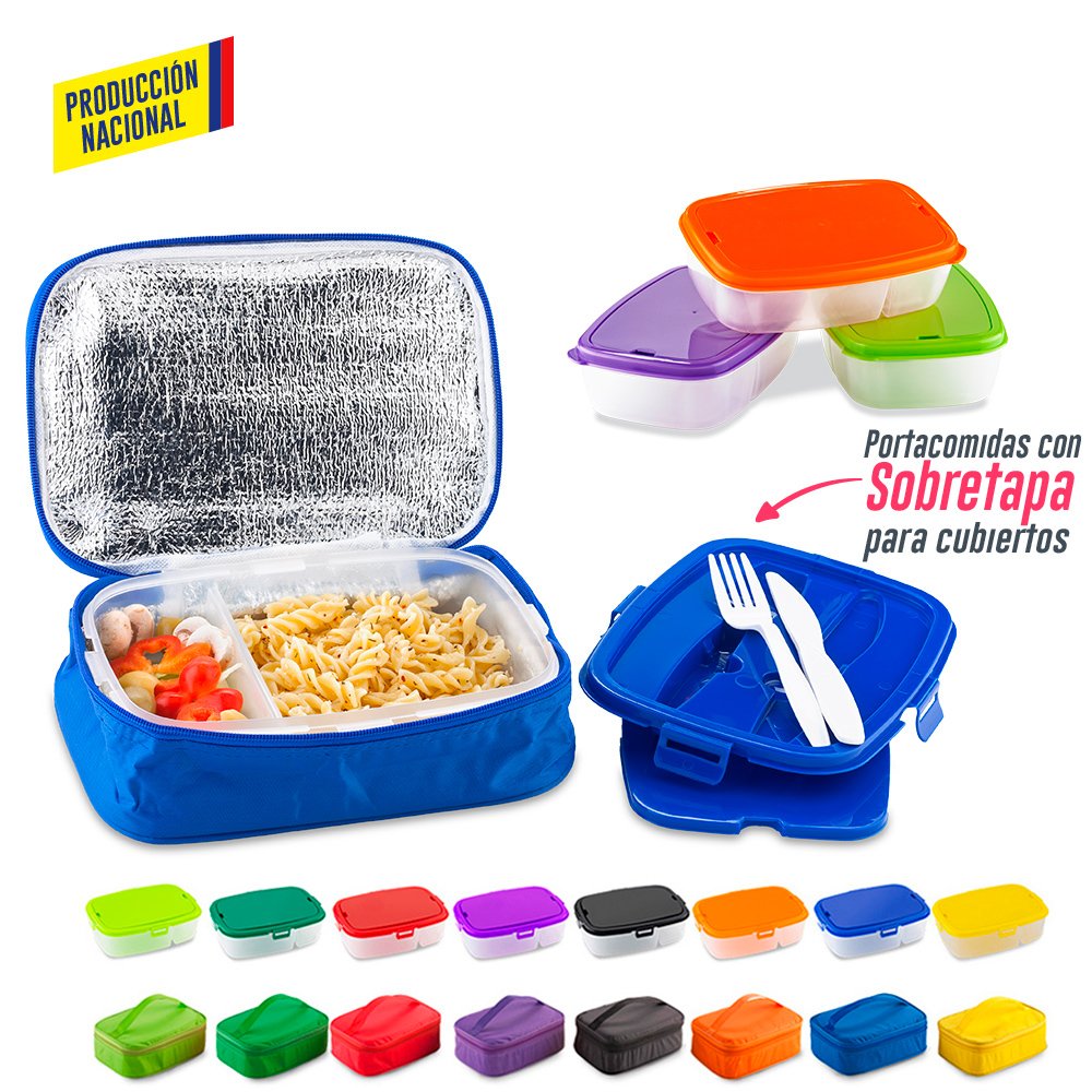 Lonchera en poliéster con portacomida plástico. Con set de cuchillo y tenedor. Cierre de seguridad. Opcional set completo, portacomidas plástico o lonchera cooler en poliéster por separado.