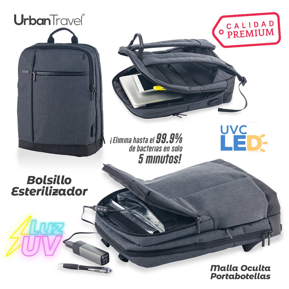 Morral en poliéster Snow, apto para portátil de 15”. Con bolsillo interno reflectante que cubre toda el área interna para esterilización mediante luz UV+UVC LED (trabaja con pila recargable no incluida). Tiempo de esterilización en ciclos de 5-30 minutos.