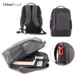 Morral en poliéster, dos bolsillos externos con cremallera, dos mallas laterales. Espaldar acolchado. Bolsillo para portátil de hasta 15”. Compartimentos internos y reata posterior para adaptar a trolley.