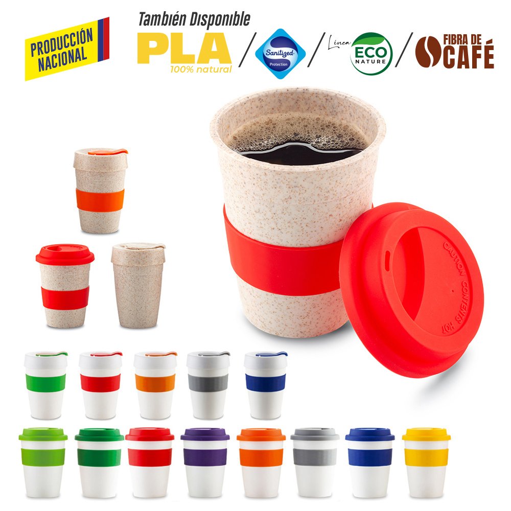 Vaso blanco en polipropileno o vaso natural polipropileno y mezcla con material ecológico en fibra de trigo (50% aprox). El porcentaje de material ecológico tiene un promedio de biodegradabilidad de 2-3 años después del fin de su vida útil.