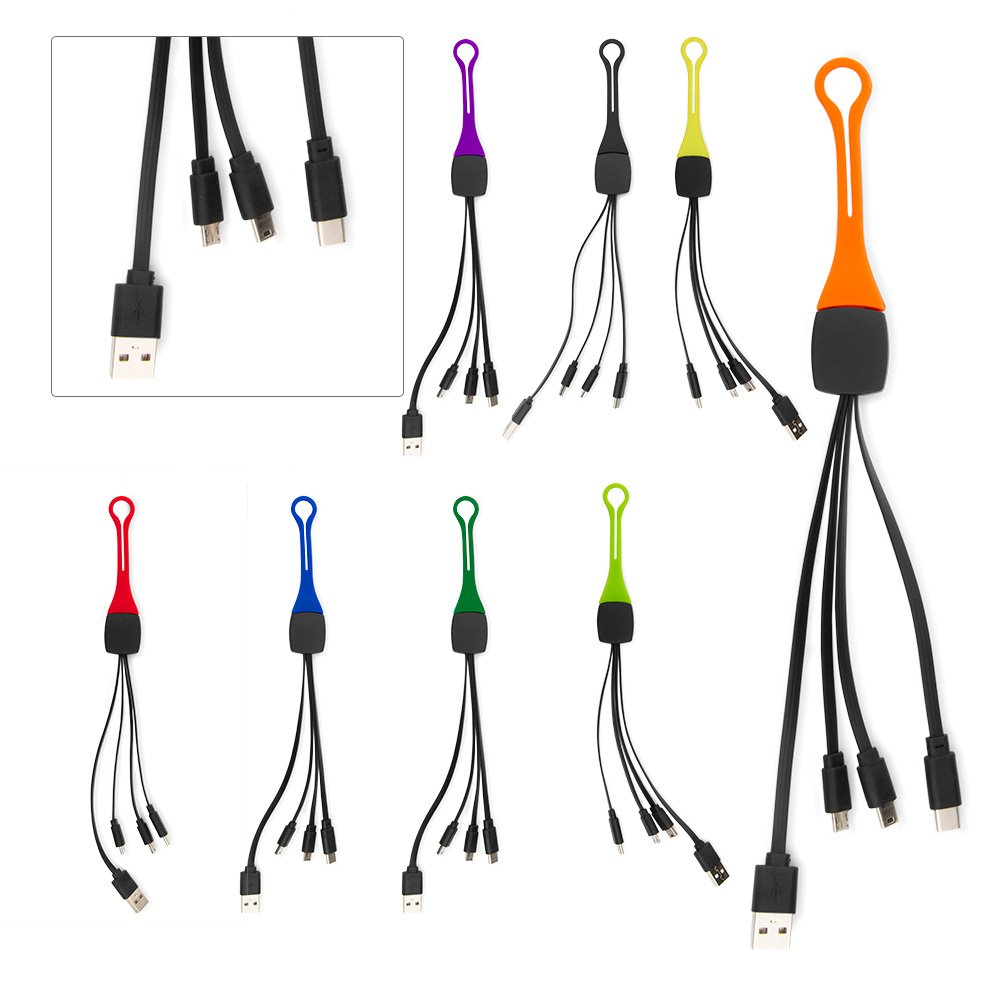 Cable multicargador USB con 4 conectores. Mini USB y Mico USB para dispositivos Andriod, tablets, MP3. Lightning para IPhone. Y conector Tipo-C.