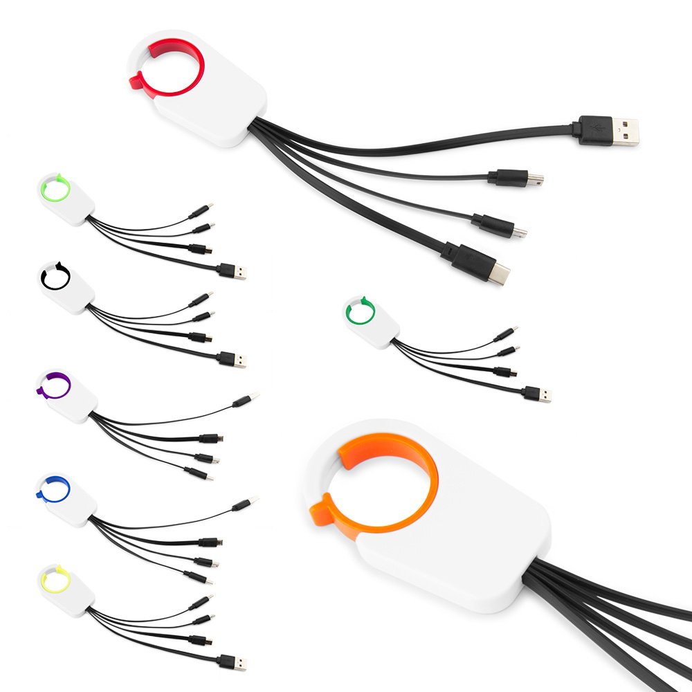 Cable multicargador USB con 4 conectores. Mini USB y Mico USB para dispositivos Andriod, tablets, MP3. Lightning para IPhone. Y conector Tipo-C.