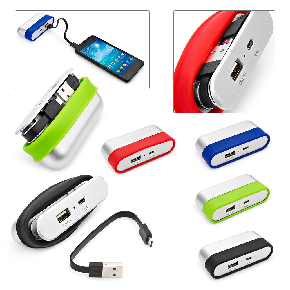 Multicargador de 2.200mAh. Entrada 5V/1A. Salida 5V/1A. Con cable USB/micro USB oculto en la parte interior de la silicona.