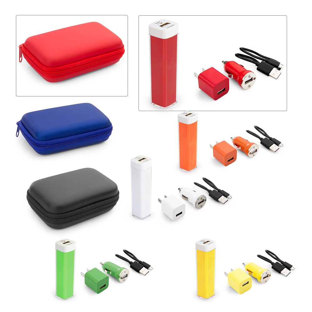 Estuche de carga que contiene: multicargador de 2200 mAh, Cable con entrada USB/micro USB; Cargador USB de carro para celular, apto para cualquier encendedor de auto. Luz LED indicadora de carga. Voltaje de entrada 12-24 VDC. Salida: 500 mA/1 Amp, Cargador de pared con 1 puerto USB, entrada 100-240V – 50/60Hz 0,15A, salida 5V-1A. Cuenta con Certificado de Seguridad UL (E361273).