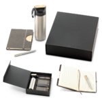 Set de lujo en caja de regalo de cartón negro con: bolígrafo metálico mecanismo twist, libreta de 80 hojas con rayas con cubierta en poliuretano (PU) y Botilito metálico doble pared de 600ml.
