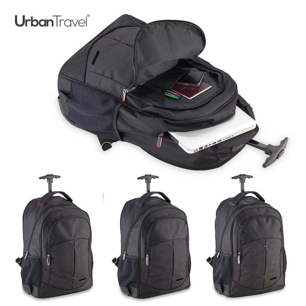 Trolley backpack en poliéster 1680D con dos compartimentos, bolsillo para portátil y dos mallas laterales.